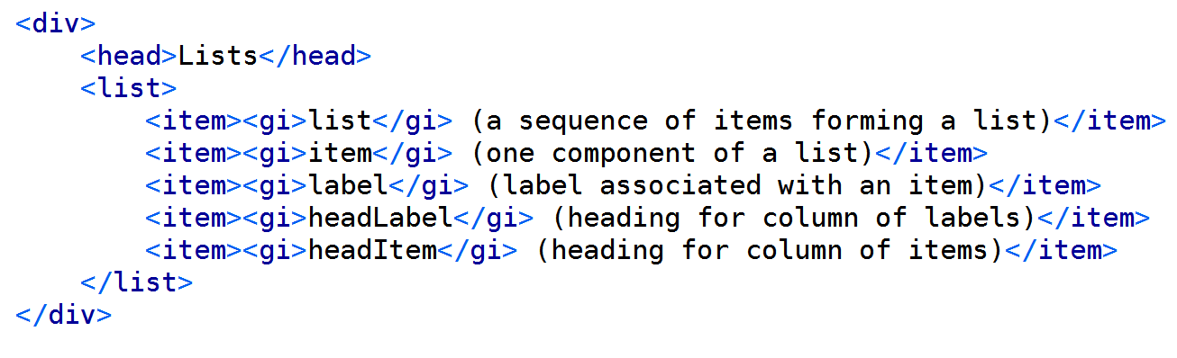 Hierarchical grouping of text sequences into textual divisions and subdivisions by means of nested <div> elements.