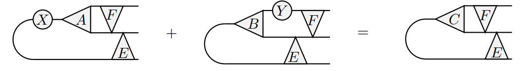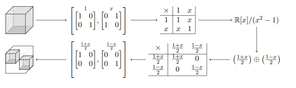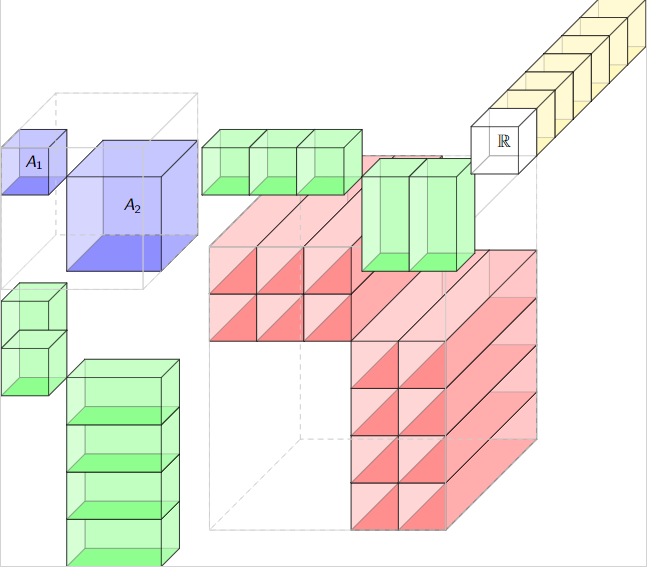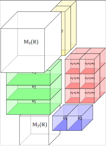 \(\mathrm{Adj}(t)\cong \mathbb{R}\oplus \mathbb{M}_2(\mathbb{R})\) \[\begin{aligned} t & \in \mathbb{R}^{10}\otimes_{\mathrm{Adj}(t)}\mathbb{R}^7 \\ & \cong (\mathbb{R}^{10}\otimes_{\mathbb{R}\oplus 0}\mathbb{R}^7)\oplus (\mathbb{R}^{10}\otimes_{0\oplus \mathbb{M}_2(\mathbb{R})}\mathbb{R}^7) \\ & = (\mathbb{R}^2\otimes \mathbb{R}^3)\oplus (\mathbb{R}^4\otimes\mathbb{R}^2)\end{aligned}\]