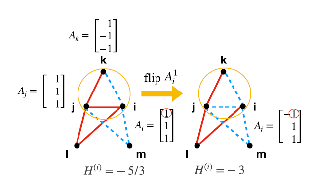 - A social stress of an individual \(i\) can be written as $$H^i(s_{i}) = - \sum_{j \in \mathcal{N}_i} A_{ij} s_i s_j - \sum_{j,k \in \mathcal{Q}_i} A_{ij} A_{jk} A_{ki}$$