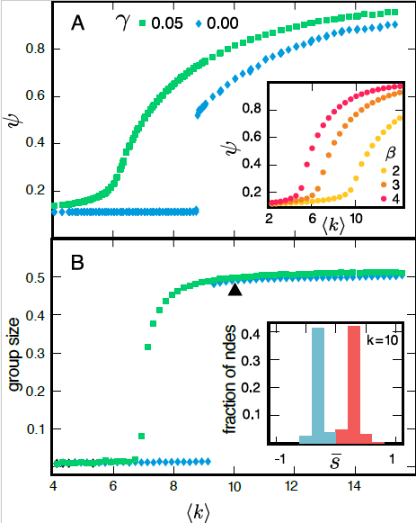 - By combining both terms, we obtain the Hamiltonian describing both homophily and social balance $$H(s_i,A_{ij})= - \sum_{ij} A_{ij} s_i \cdot s_j - g \sum_{ijk} A_{ij}A_{jk}A_{ki}$$