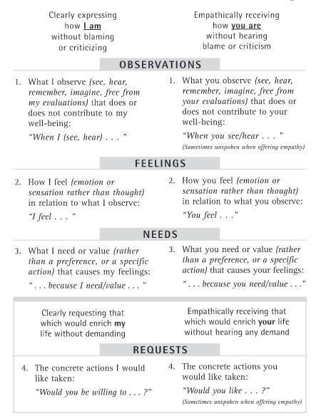We have now covered the first three components of NVC, which address what we are observing, feeling, and needing. We have learned to do this without criticizing, analyzing, blaming, or diagnosing others, and in a way likely to inspire compassion.