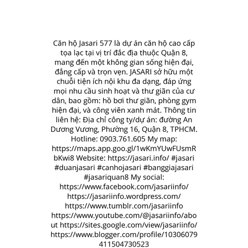 Website: https://jasari.info/. Căn hộ Jasari 577 là dự án căn hộ cao cấp tọa lạc tại vị trí đắc địa thuộc Quận 8, mang đến một không gian sống hiện đại, đẳng cấp và trọn vẹn. JASARI sở hữu một chuỗi tiện ích nội khu đa dạng, đáp ứng mọi nhu cầu sinh