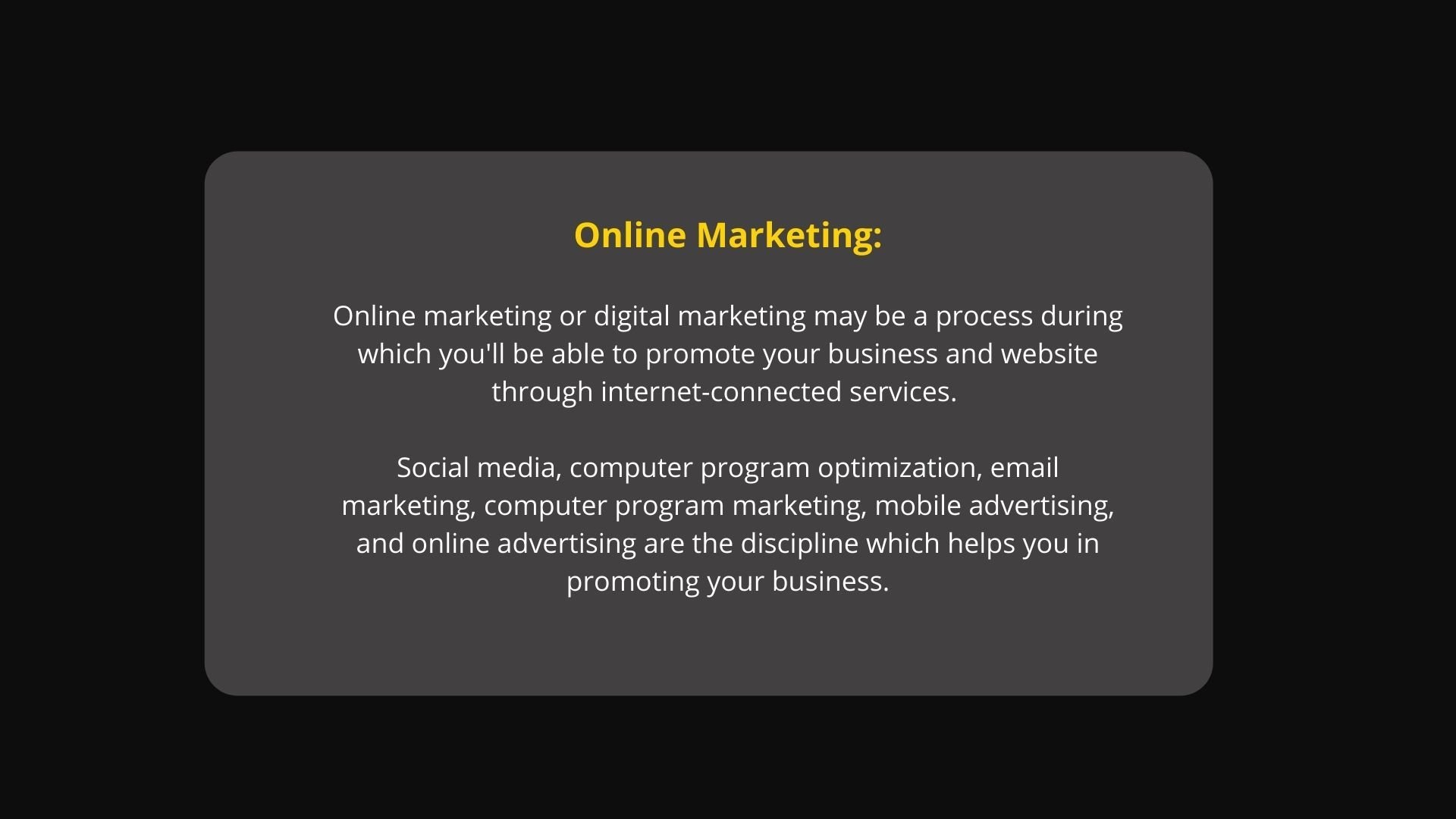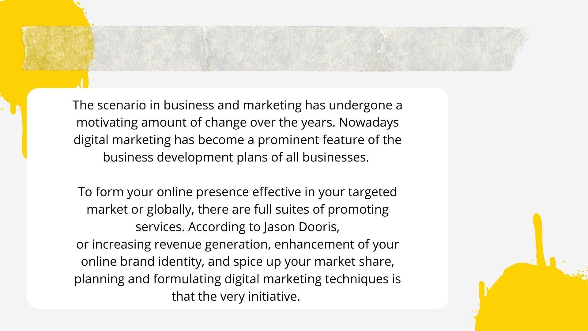 To form your online presence effective in your targeted market or globally, there are full suites of promoting services. According to Jason Dooris, increasing revenue generation, enhancement of your online brand identity, and spice up your market share, planning and formulating digital marketing techniques is that the very initiative.