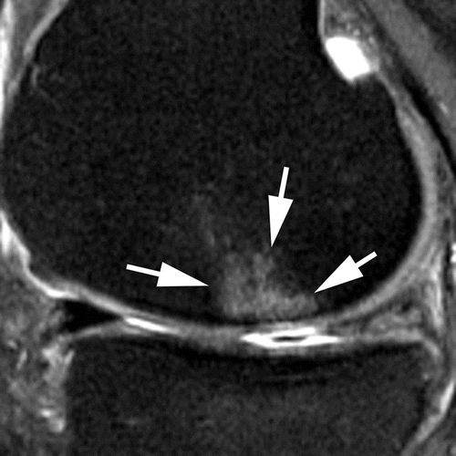 MRI: bone marrow, synovitis, effusion, periarticular cystic lesions, meniscal tears