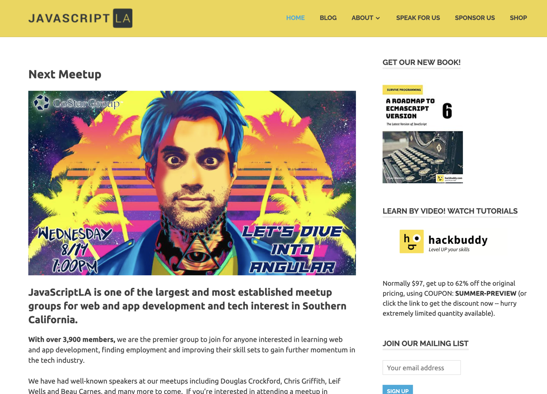Slides.com website for JavaScriptLA -- use this place to find our meetup group presentations. Want more? Visit our website at: https://www.javascriptla.net to get on our mailing list.