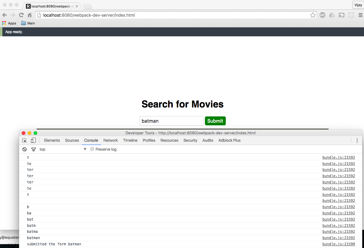 Let's also get the actual input value from our searchform, and then set it on our searchform's state object for "term". We'll then submit "term" to our App Component, which will handle the AJAX call.