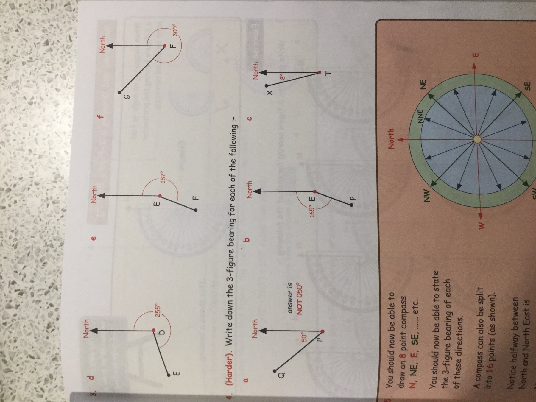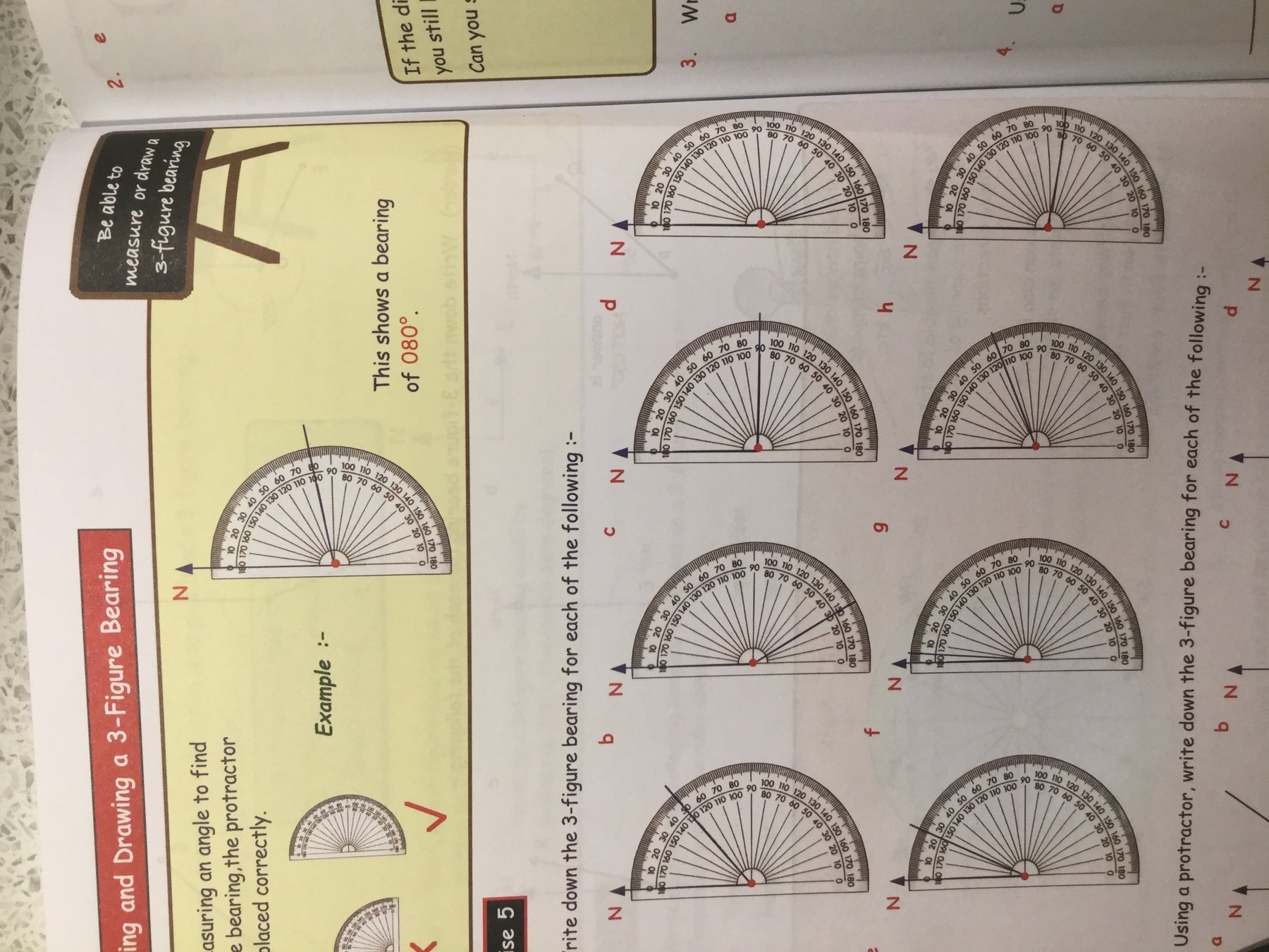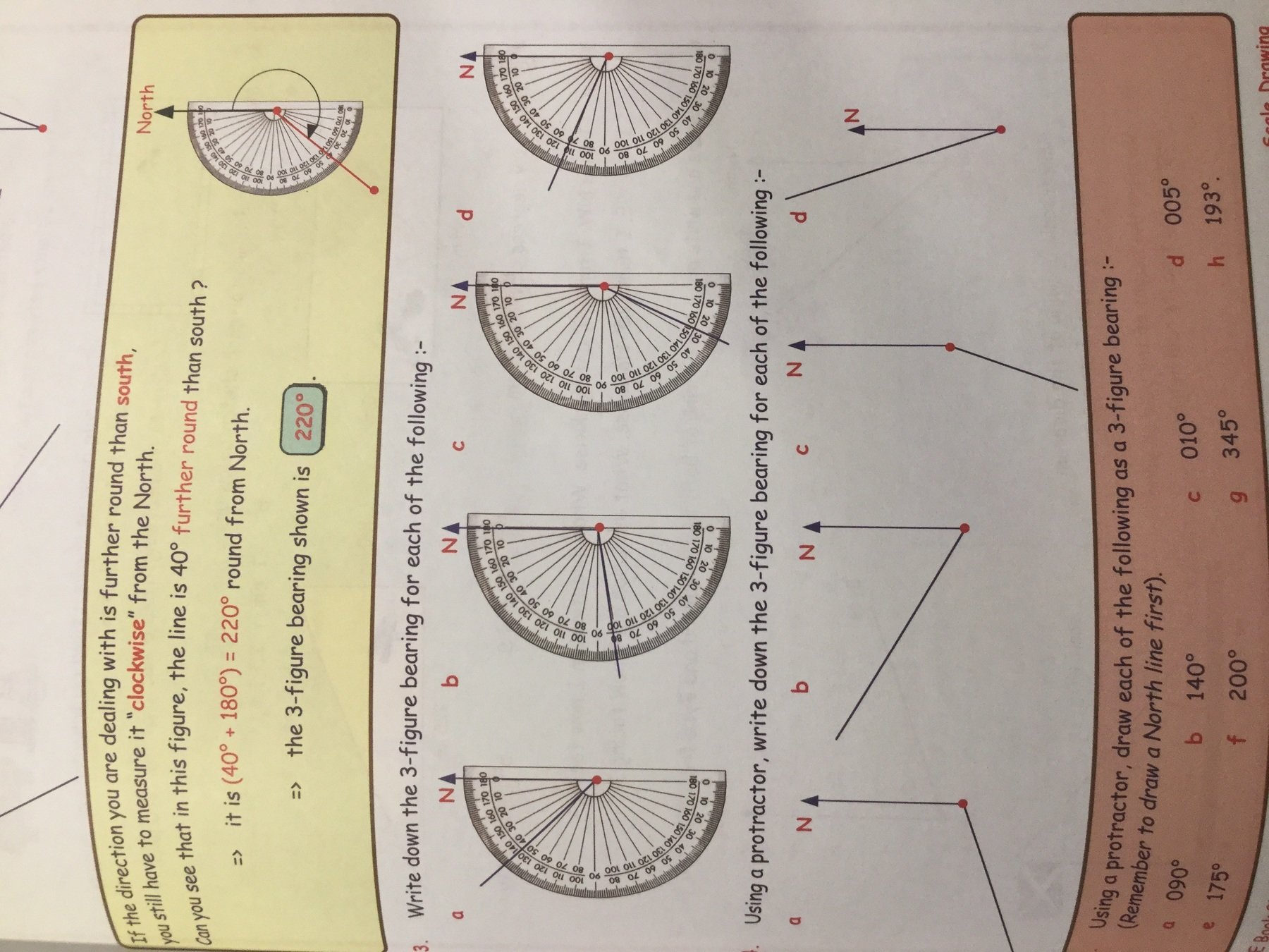 ·# Starter: Labeling bearings from one big circle ·Next to the objects, write down the 3 digit bearing from the center to the different objects. · ·# Measuring angles and converting them into bearings ·## TeeJay pg62,63 Ex.5 Q2 a,b,c,d & Q4 a,b,c,d · ·# Recap what we learned from our experience in the Outdoor Activity · ·# Bearing “from” vs. Bearing “of” (draw diagram example) ·"to": from to ·"of": of from · ·# Complete Dr. Brookman’s 1993 bearings worksheet (finish for prep) · ·You started by reading and interpreting bearings. · ·Now you need to write and explain using bearings. · ·And if we have a scaled map, we can measure it (and do scale-drawing calculations) to calculate real-life distances!