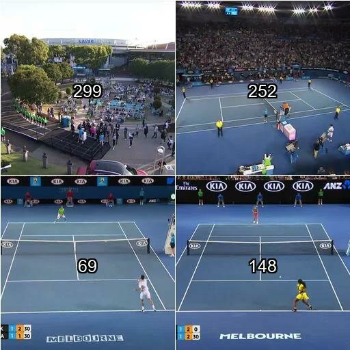 NON-PLAYING scenes show any other content that is not a standard broadcast view of the court, including low-angle, court-side, zoom-in, or audience shots. Respond just in a JSON using the centered number (white text with black outline) in each square as the index for each frame."