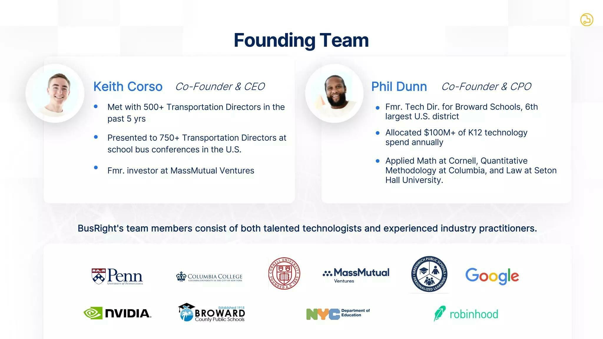 Founding Team Keith Corso Co-Founder & CEO Phil Dunn Co-Founder & CPO Met with 500+ Transportation Directors in the Fmr. Tech Dir. for Broward Schools, 6th past 5 yrs largest U.S. district Allocated $1OOM+ of K12 technology Presented to 750+ Transportation Directors at spend annually school bus conferences in the U.S: Applied Math at Cornell, Quantitative Fmr. investor at MassMutual Ventures Methodology at Columbia, and Law at Seton Hall University. BusRight's team members consist of both talented technologists and experienced industry practitioners. Sc Penn COLUMBIA Coitn nntan COLLEGE 4TW Antora Ventures MassMutual Google Wiai elabkhed 1915 Department of NVIDIA BROWARD NC Education robinhood County Public Schools PUBLIC _ wich , "RSONALIZCD 'LEARNIN