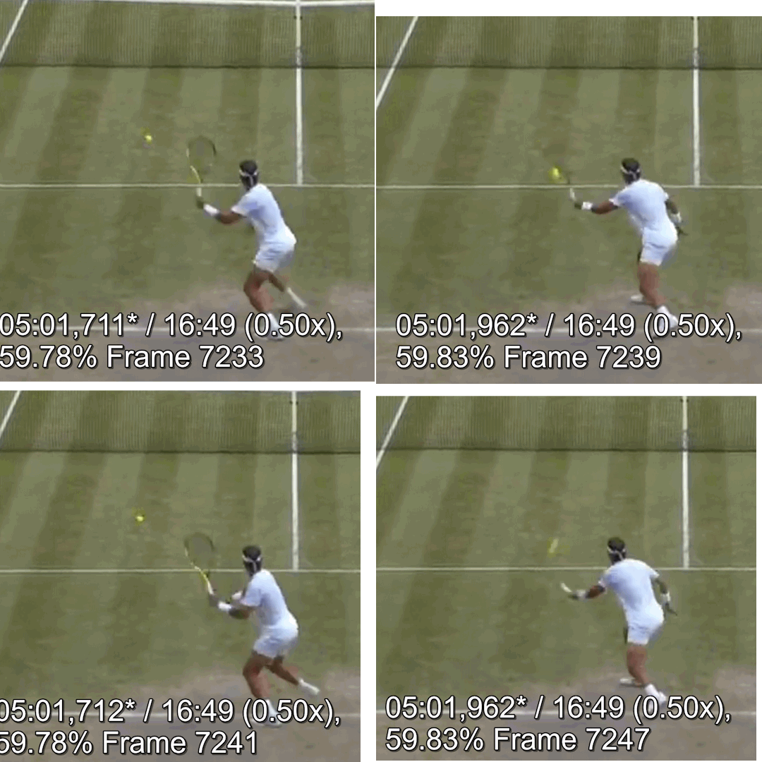 PLAYING scenes only show the tennis court from the standard broadcast angle, fully visible and vertically & horizontally aligned with the court lines (the audience should at most be barely visible).
