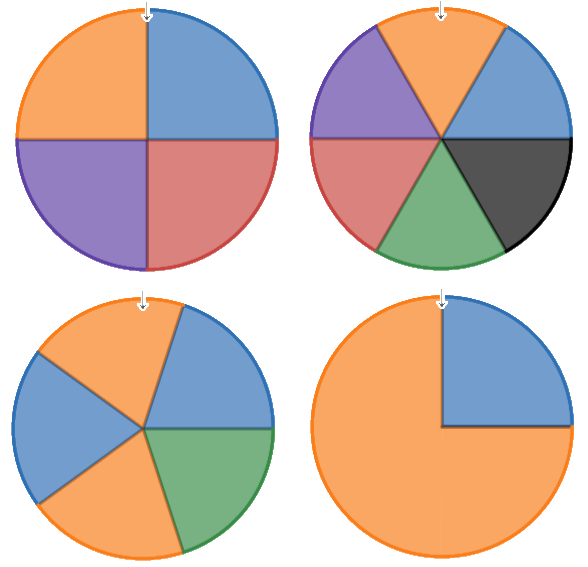 ·# Probability Number Line [Drawn on Board] (Exciting Vegas Cover Picture) · ·impossible unlikely even 50/50 likely certain ·0 0.5 1 ·A B C D E F G · ·# Describing Probability with Words (Qualitative) ·An event's probability is a prediction of how LIKELY it is to occur e.g. ·impossible unlikely even 50/50 likely certain · ·# Estimate the Likleyhood of Different Events ·https://www.menti.com/hpippc1cdf ·1. P(A bus stops in George Street within 10mins) ·2. P(you see a bright pink Lamborghini in a car park) ·3. P(an equilateral triangle has a 60° angle) ·4. P(the next baby born in a family is a girl) ·5. P(Saturday is 3 days after Tuesday) ·6. P(it rains on at least 1 day in April) ·7. P(a wife is taller than her husband) ·Answers: 1. E 2. B 3. G 4. D 5. A 6. F 7. C ·Invent your own events. Locate their probability on the scale using words, numbers, and labels · ·# Describing Probability with Numbers (Quantitative) ·It is a number between 0–1, with no units. ·It can be written as a percentage, or more commonly as fraction or decimal. ·Express probabilities as 1/2 (0.5) rather than "1 in 2", because a probability is always a number in-between or equal to 0 or 1 ·This is a fraction, we should always simplify fractions (e.g. the probability 6/15 = 2/5) · ·# Calculate Probabilities Using Frequency ·To compare probabilities, we need a fair way to measure them (to put numbers on them). ·Probability = P(number of the events we want) / P(number of all the possible events) · ·# Examples of Counting the Number of Possible Cases (Quickly with Show-Me Boards) ·Coin flip / Dice / Egg Cartons / Truck Wheels / Different Spinners · ·# How to Write Probability Equations ·We can write a probability in an equation: ·"The probability of event 'X' happening is 1." ·becomes: "P(event 'X') = 1" ·Or even shorter: P(X)=1 · ·# Probability of Rolling a 6 on a Cube ·There is only one '6' out of the 6 sides of a dice, there is only one 'blue' side on a fully-solved Rubik's cube. [Roll a cube around as an example of a large dice]. · ·# Exercise 2 page 161 Questions 1-6 · ·# Easier vs. Harder Dice Games ·Take a dice game where you win if you roll 5 or 6, and lose otherwise. Is it more likely to win this game or to lose it? [2 cases / 6 possible] ·Compare this probability to a game where you only win if you roll a 6. · 2/6 > 1/6 · 1/3 > 1/6 ·33.3% > 16.67% · ·# Opposite Probabilities ·If P(A) is the probability that A happens, the opposite probability (the probability that A does NOT happen) is calculated using 1-P(A) . ·Page 161 Question 6: 4 marbles, 1 blue 3 red. P(red)+P(blue)=1 so P(blue)=1-P(red)=1-3/4=1/4 · ·# Probability Kahoot https://create.kahoot.it/details/probability/cab63a54-cac7-41d1-9e46-72f5235e800d