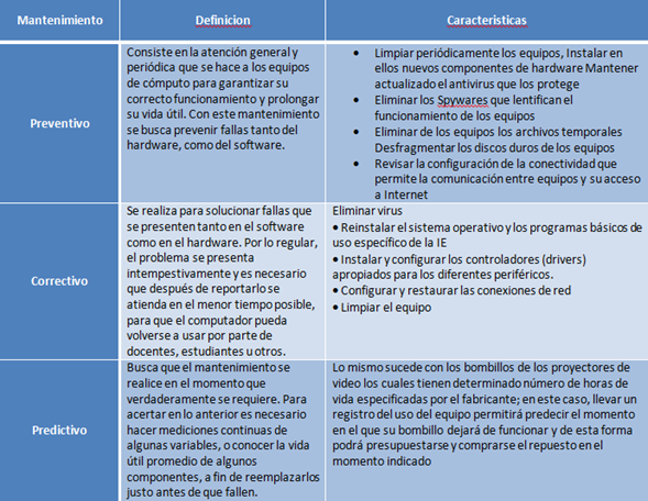 Completa la tabla con información sobre los tres tipos de mantenimiento que se deben dar a las computadoras.