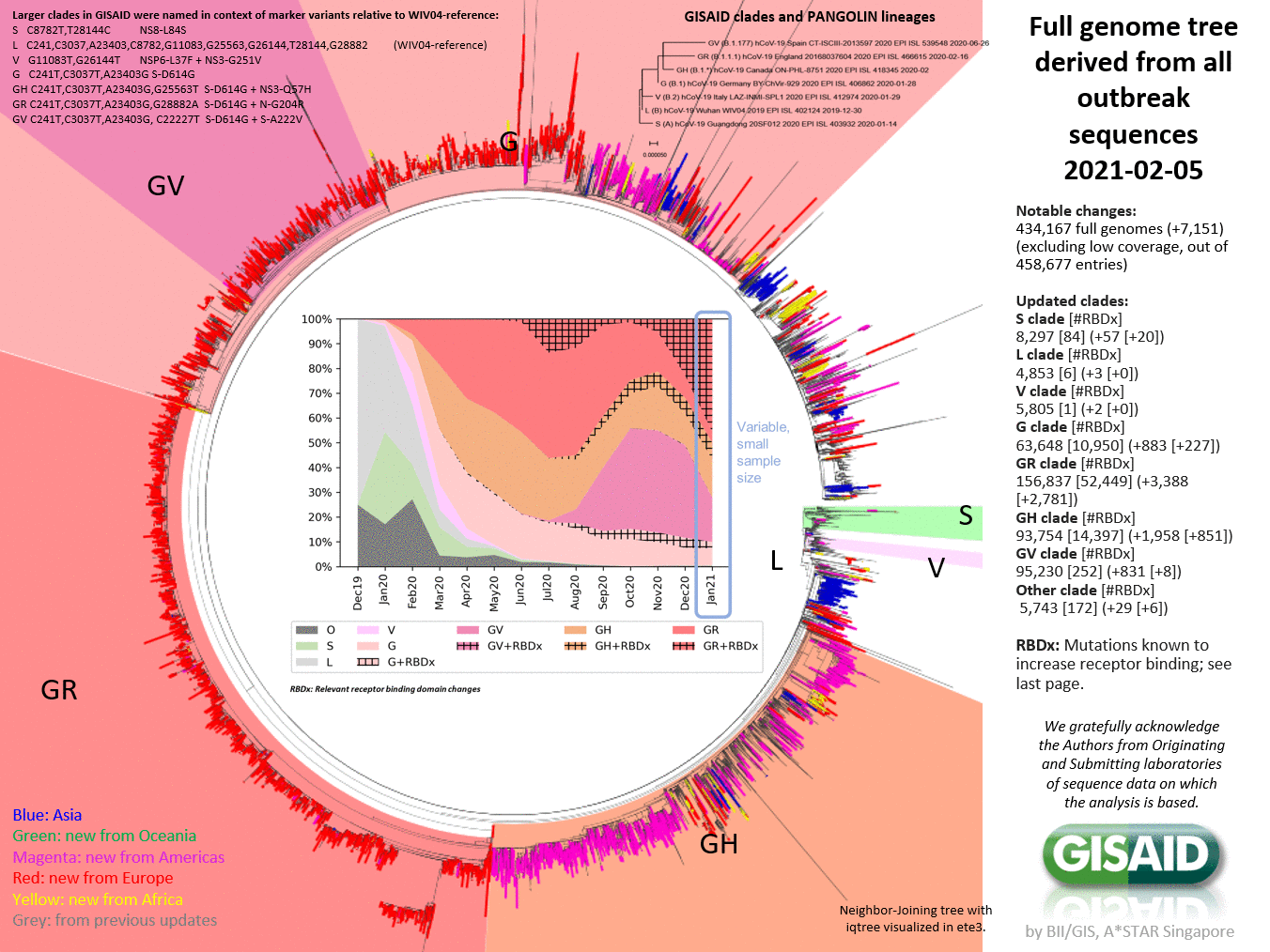 Phylogenetic tree of 434,167 full-length SARS-CoV-2 genomes provided by GISAID