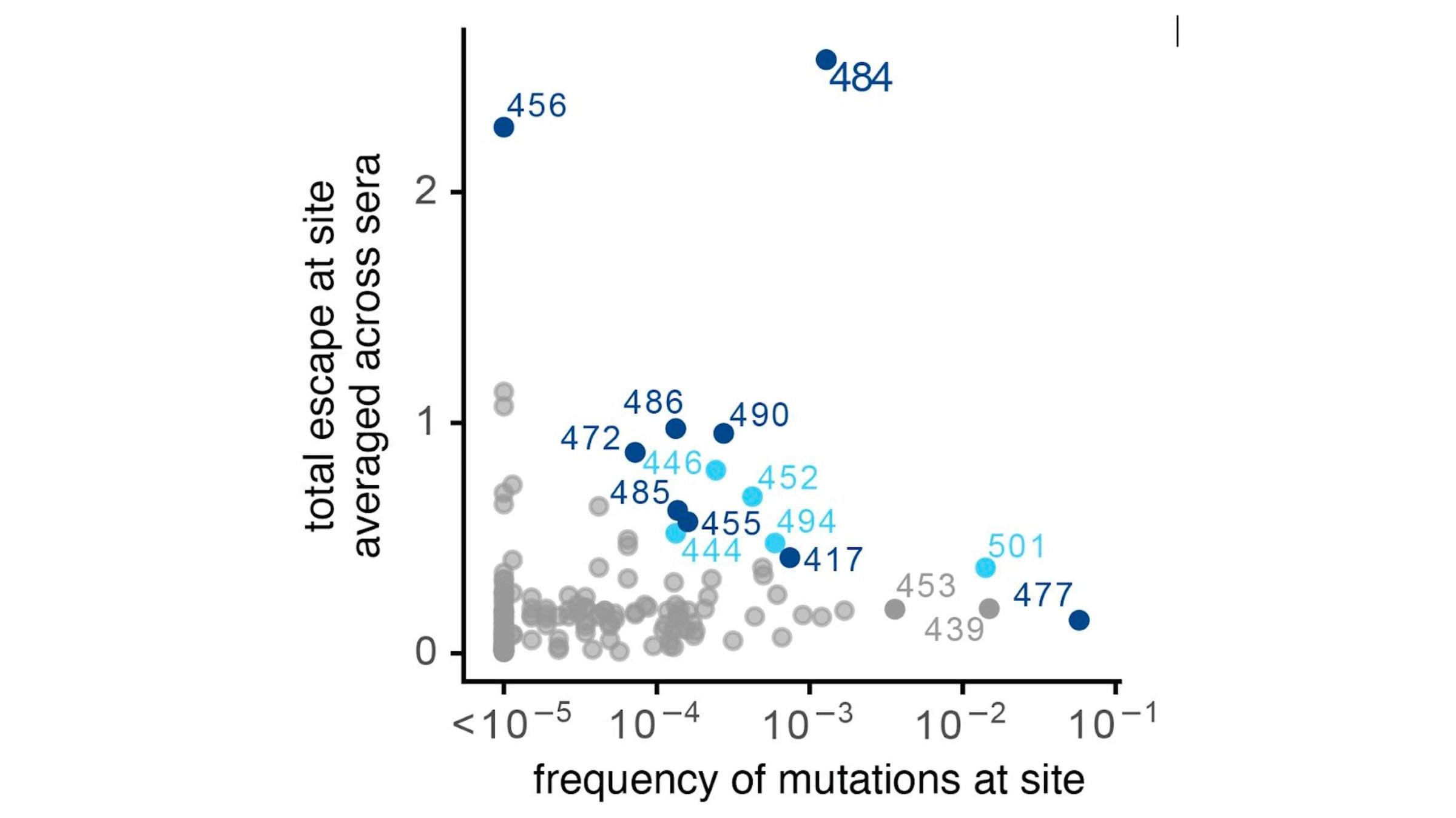 Mutations that affect recognition by human sera. Tall letters mean mutation reduces binding by serum antibodies. See this Twitter thread for details.
