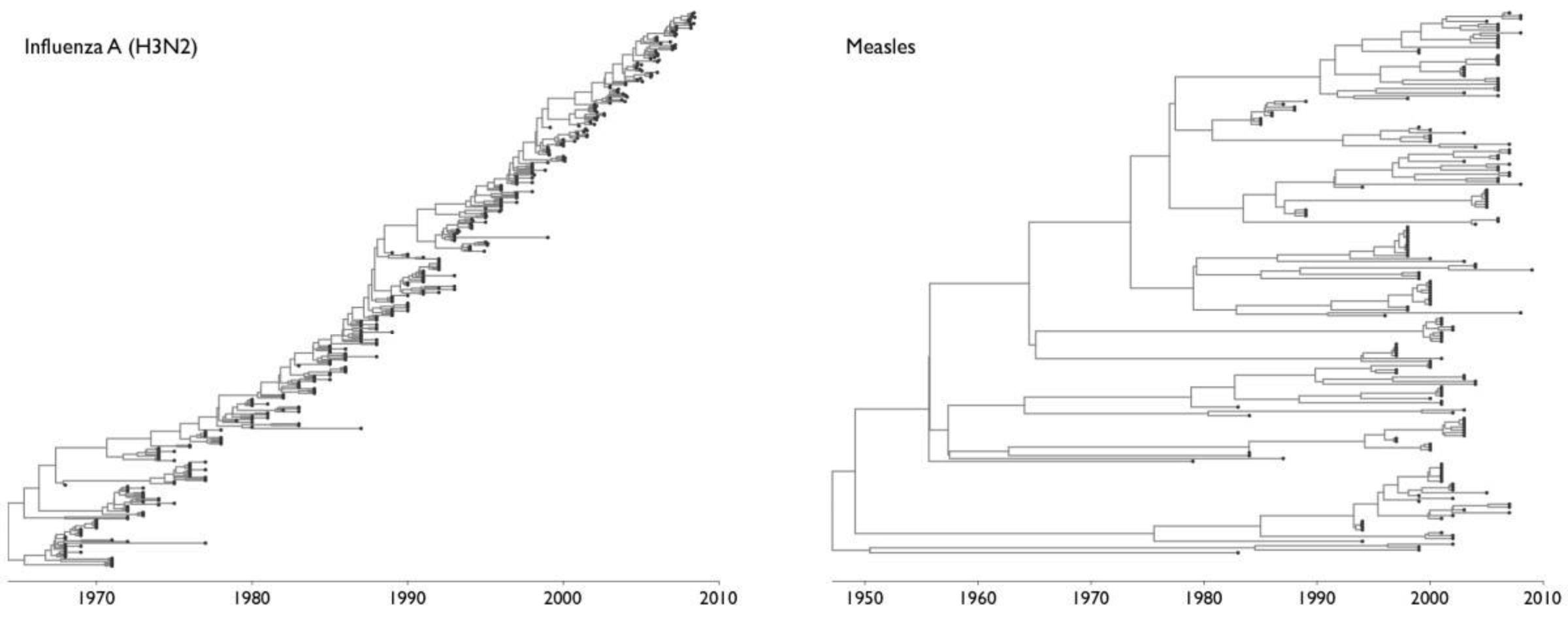 On this timescale, a bushier tree suggests lack of adaptive evolution. In measles, this fits with a known lack of antigenic evolution