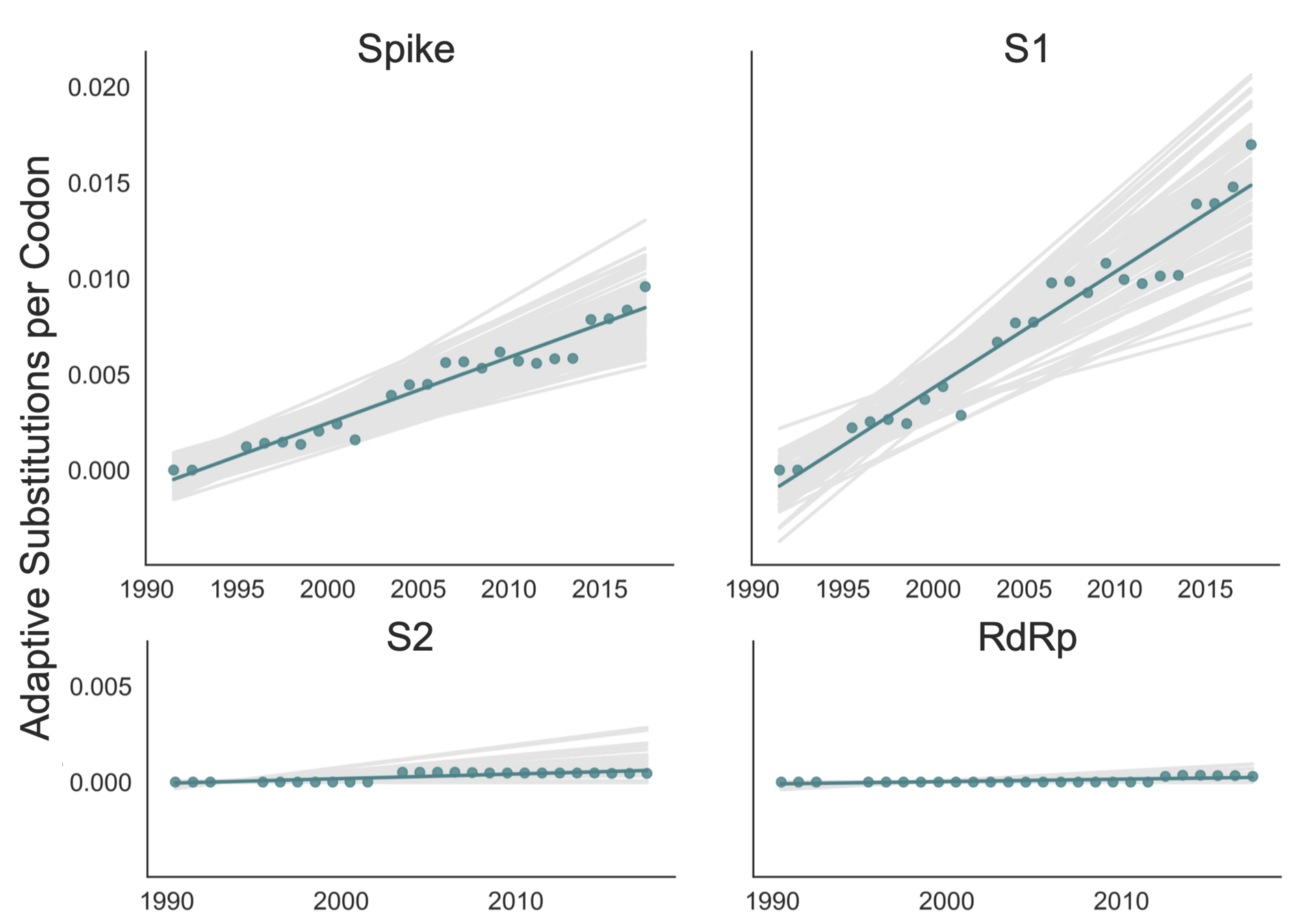 OC43 and 229E accumulate adaptive substitutions in S1 at a rate similar to influenza B viruses