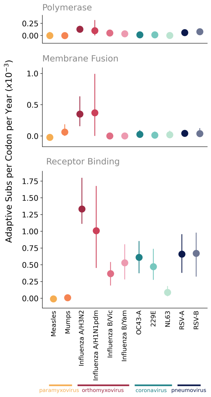 In viruses that have been endemic in humans for many decades, ongoing adaptive evolution of the receptor-binding protein/ subunit is typically driven by immune evasion