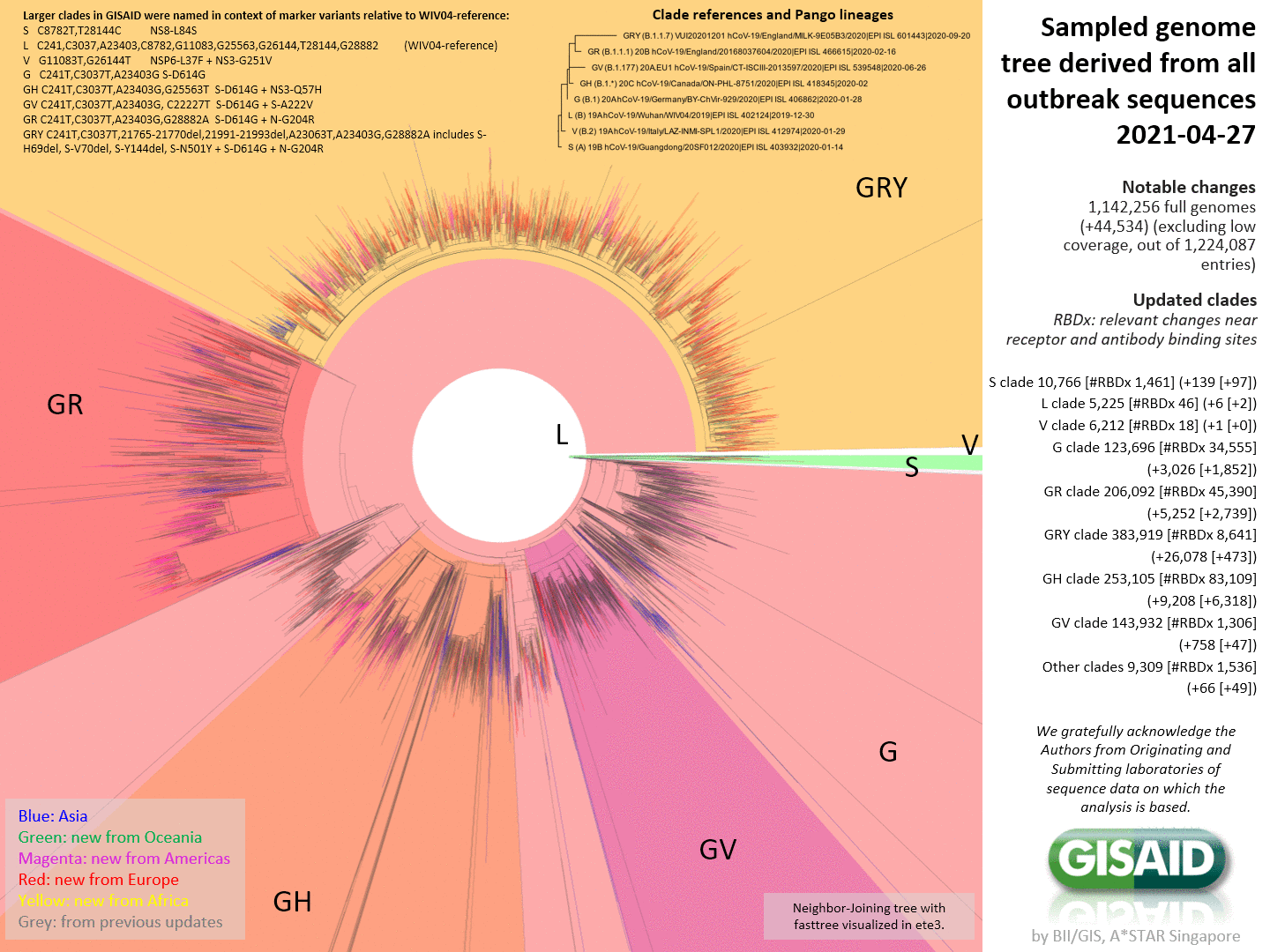 Phylogenetic tree of 1,142,265 full-length SARS-CoV-2 genomes provided by GISAID