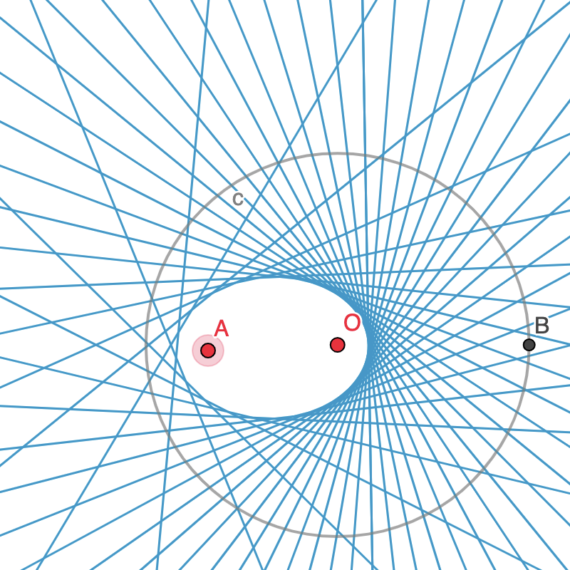 Considera ahora un círculo, un punto C (adentro del círculo) y D que se mueva sobre la circunferencia. Traza las mediatrices del punto C y D.