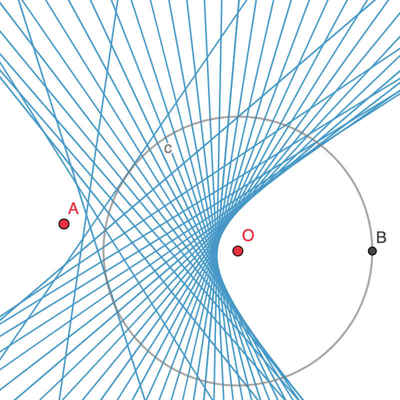Considera ahora un círculo, un punto C (afuera del círculo) y D que se mueva sobre la circunferencia. Traza las mediatrices del punto C y D.