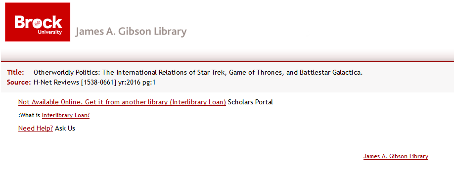 As you do your research, you will sometimes encounter this screen - meaning we don't have what you are looking for at Brock.