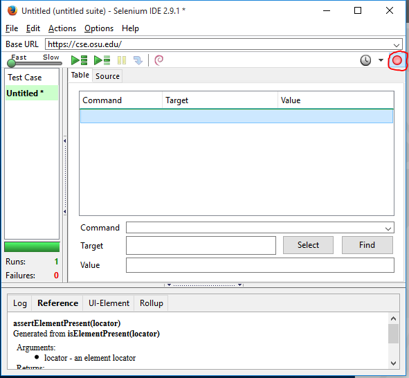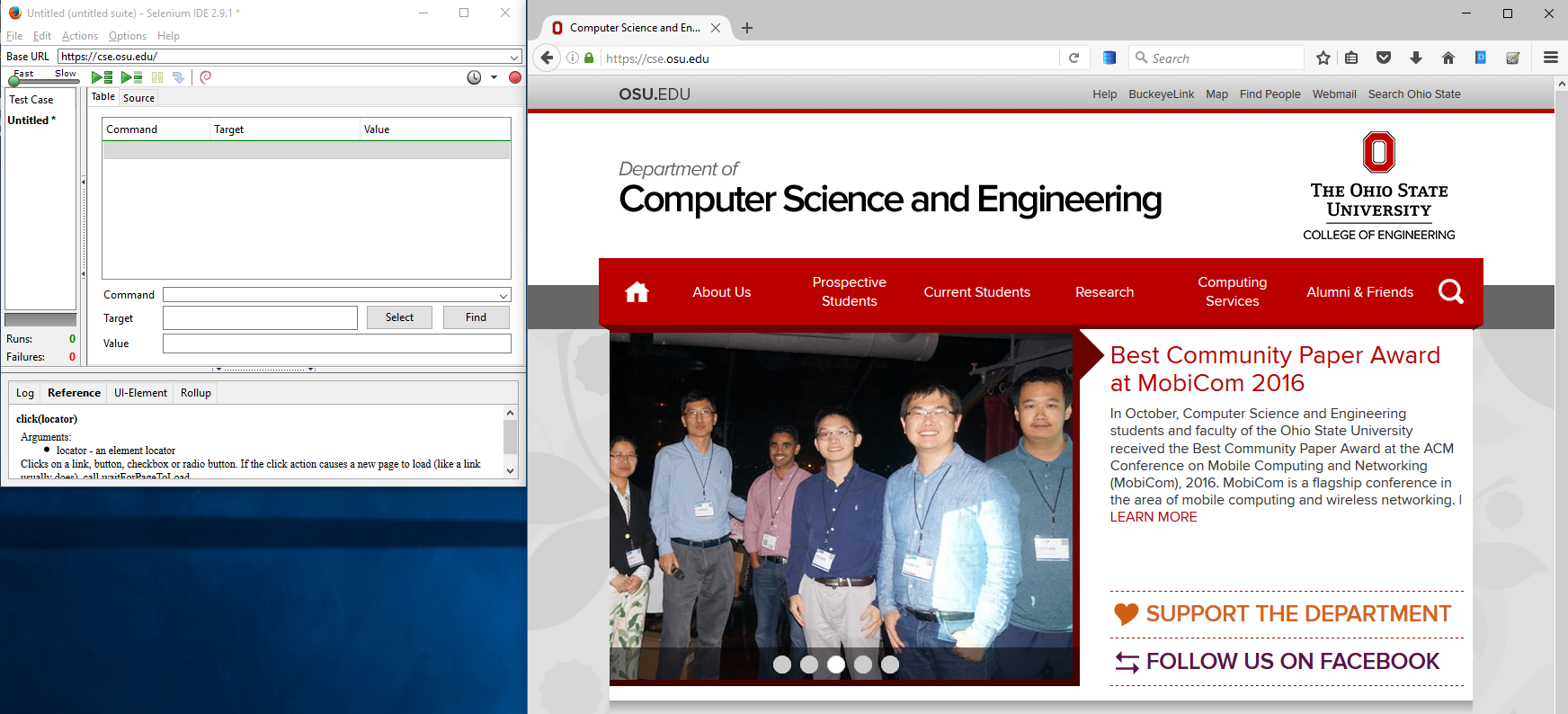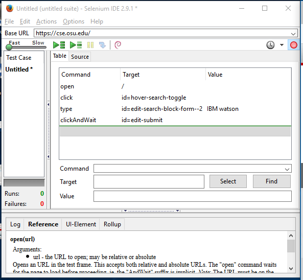 1. Open Firefox, go to osu cse website. Then, open Selenium IDE (‘Tools’ → ‘Selenium IDE’).