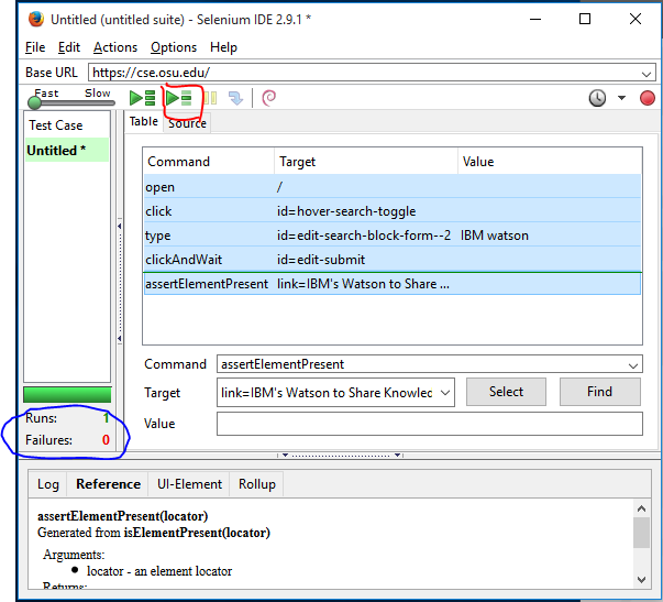 7. The command should appear in the IDE now. "Click on Play Current test case" to test this test case. You should see no Failures.