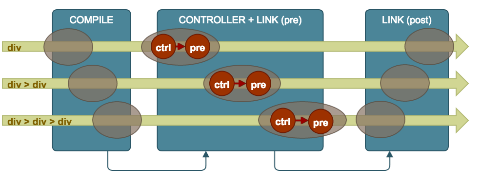 When the application bootstraps, Angular starts parsing the DOM using the $compile service. Template loads with all the angular directives Angular script loads, it looks for ng-app to find application boundaries Compile phase - angular traverses the DOM to find registered directives and transform them - this only happens once when the directive is being registered. Link phase - this runs a link function which creates event listeners or carries out DOM manipulation - this happens for every instance of a directive