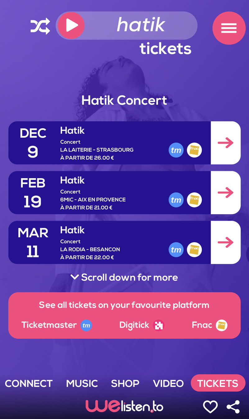 Vente de ticket, redirection vers toutes les plateformes de revente.(Digitick, Ticketmaster, ...)