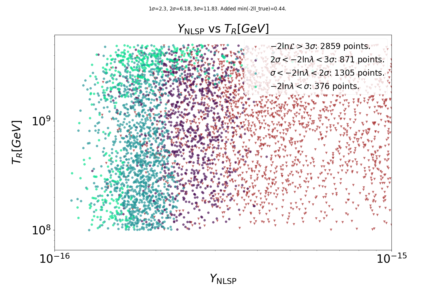 Construct a likelihood \(\mathcal{L}_\mathsf{scan} = \mathcal{L}_\mathsf{relic\ density} \times \mathcal{L}_\mathsf{BBN} \times \mathcal{L}_\mathsf{collider} \times \mathcal{L}^\mathsf{fake}_\mathsf{T_R}\).