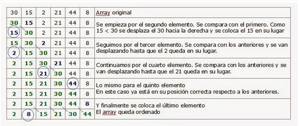 Para cada elemento, se trata de colocarlo en el lugar correcto entre todos los elementos anteriores a él o sea entre los elementos a su izquierda en el array.