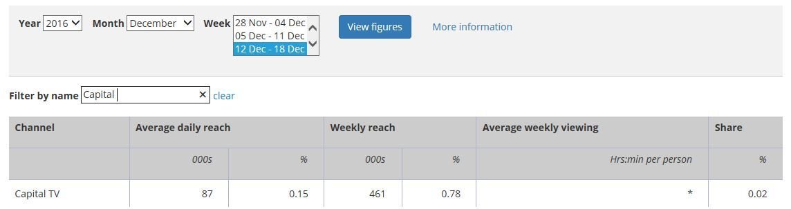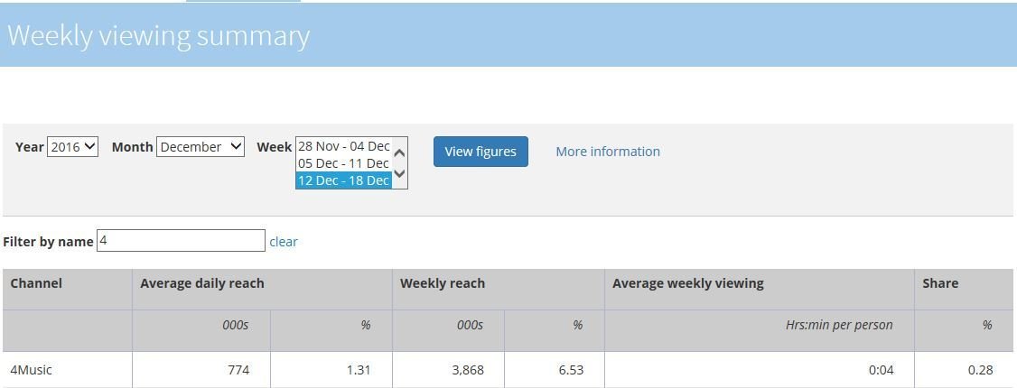 To exhibit our video on a music channel I would ensure that it is used on 4music as that channel is free and can be seen through signal, Sky and Freeview whereas other channels are not seen. This can be noted as the average daily reach between the 12th and 18th of December for 4Music is 774 whereas a paid channel such as Capital is 87 for their daily reach. This connotes how using the free channel we are more likely to be noticed with an average more viewings of 687. Additionally, this channel is appropriate for the younger generation within our target market as well as our young adults therefore would be a perfect channel to exhibit our video.