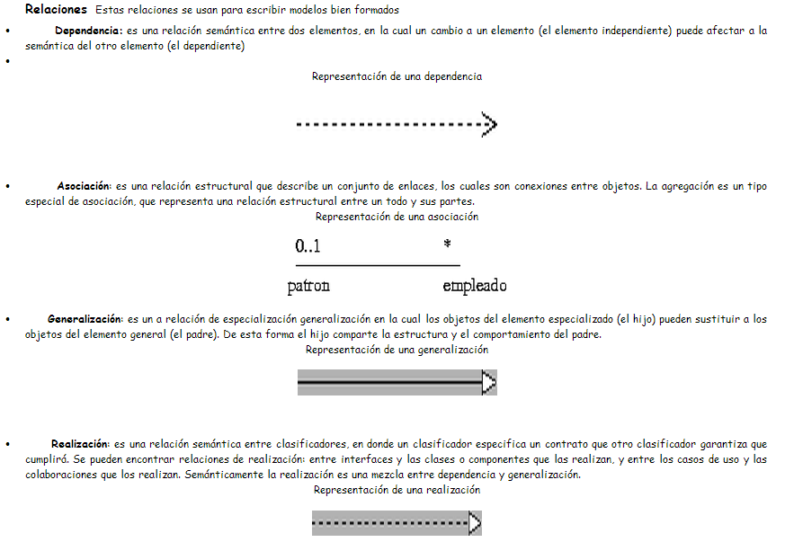 2. Relaciones: Estas relaciones se usan para escribir modelos bien formados y ligan los elementos entre sí. Hay cuatro tipos de relaciones en UML: dependencia, asociación, generalización, realización.