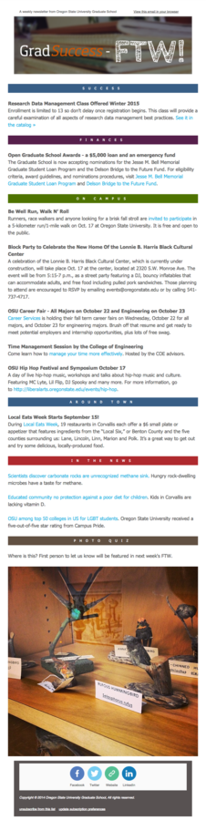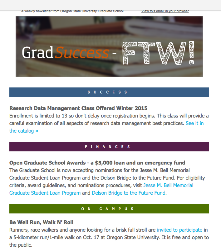 The purpose of this communication initiative is to support the The Graduate Student Success Initiative (GSSI). The GSSI strives to improve all aspects of the graduate school experience for students and their mentors (graduate faculty) by: