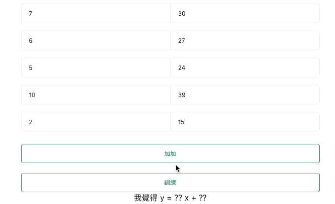 - 評估(Evaluation):隨機抓一部分的已知資料,測試模型的準確率,這步驟是『驗證』(Validation) ,來評估模型距離正確答案還有多遠。