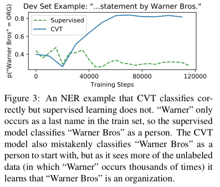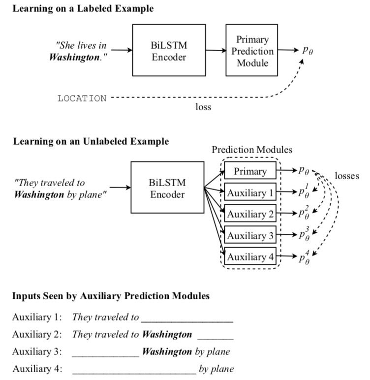 [Unlabeled examples] train auxiliary prediction modules with different views of the input to agree with the primary prediction module.