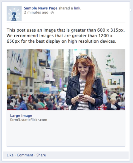 Use images that are at least 1200 x 630 px for the best display on high resolution devices. At the minimum, you should use images that are 600 x 315 px to display link page posts with larger images.