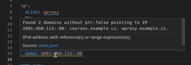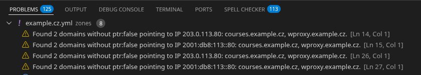 2) WARNING: Found 2 domains without ptr:false pointing to IP 2001:db8:113::80: courses.example.cz, wproxy.example.cz.