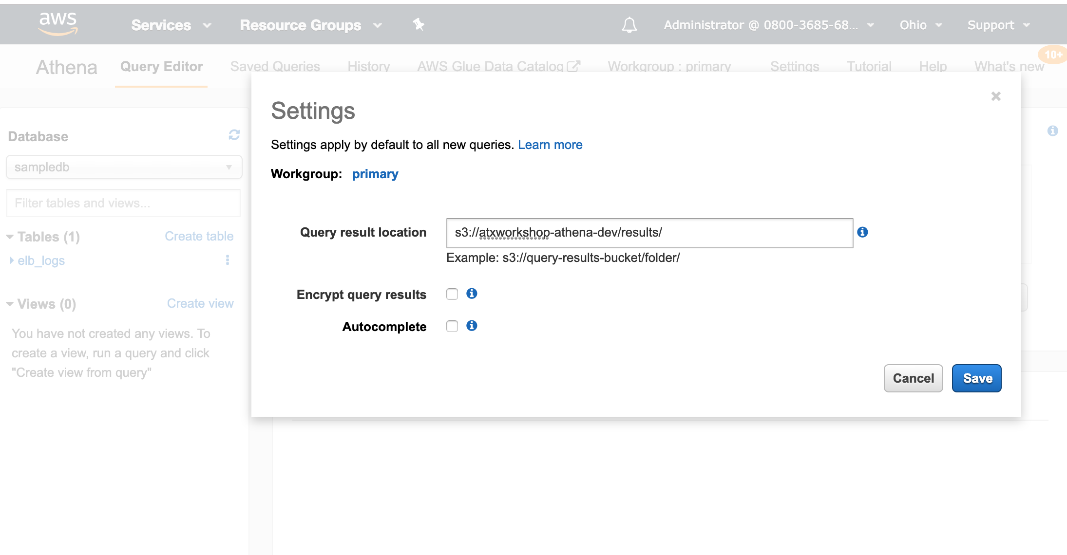 Query result location: s3://atxworkshop-athena-dev/results/