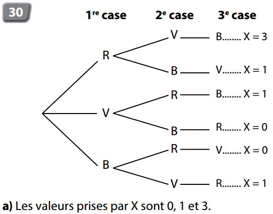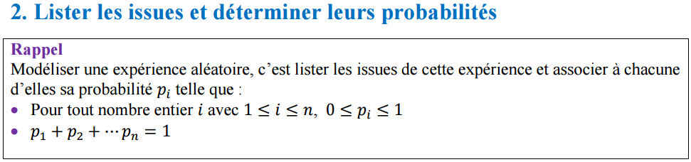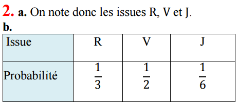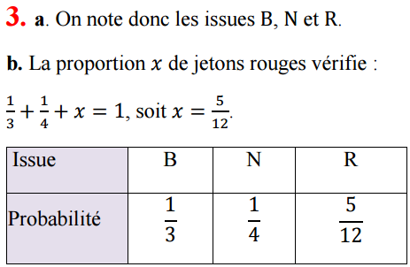 Un sac contient un tiers de jetons blancs, un quart de jetons noirs et le reste de jetons rouges. On tire au hasard un jeton du sac et on note sa couleur. a. Lister les issues de cette expérience aléatoire. b. Déterminer la probabilité de chacune d’elles.