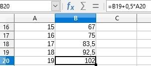 2) La cellule B20 contiendra la formule = B19 + 0,5*A20