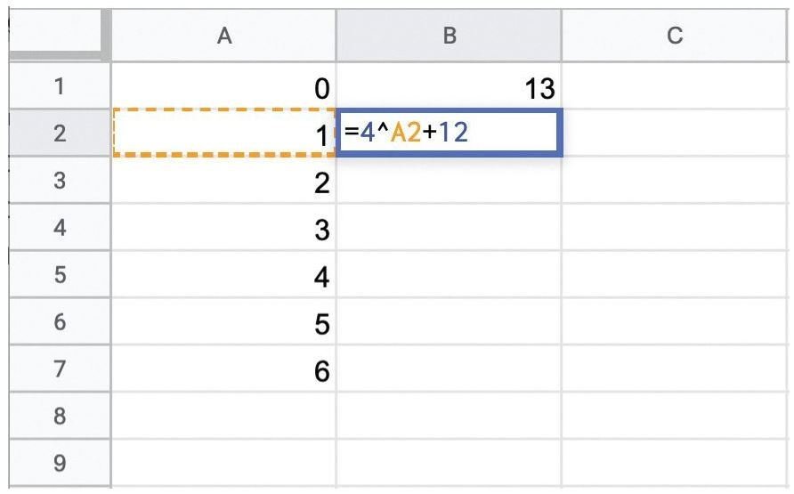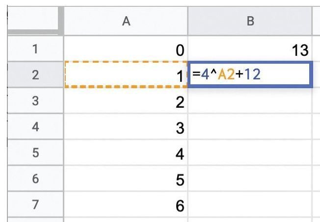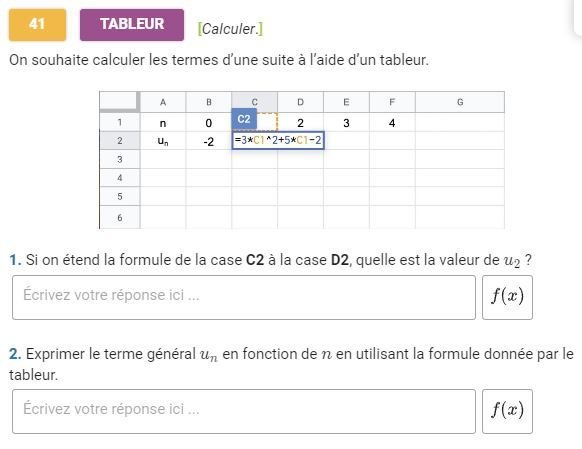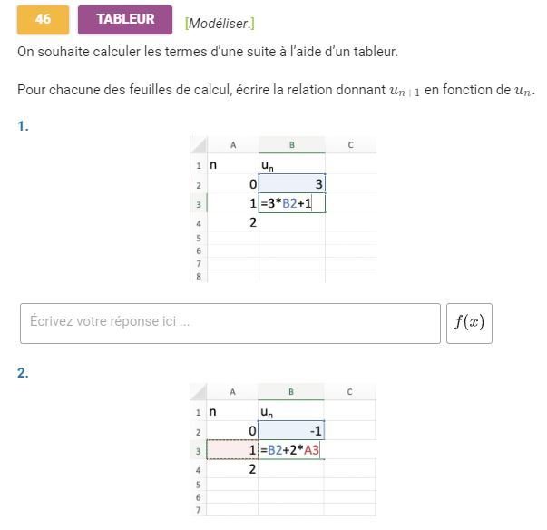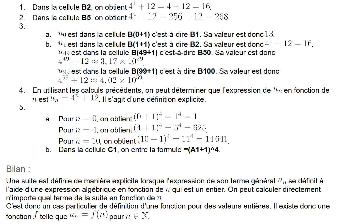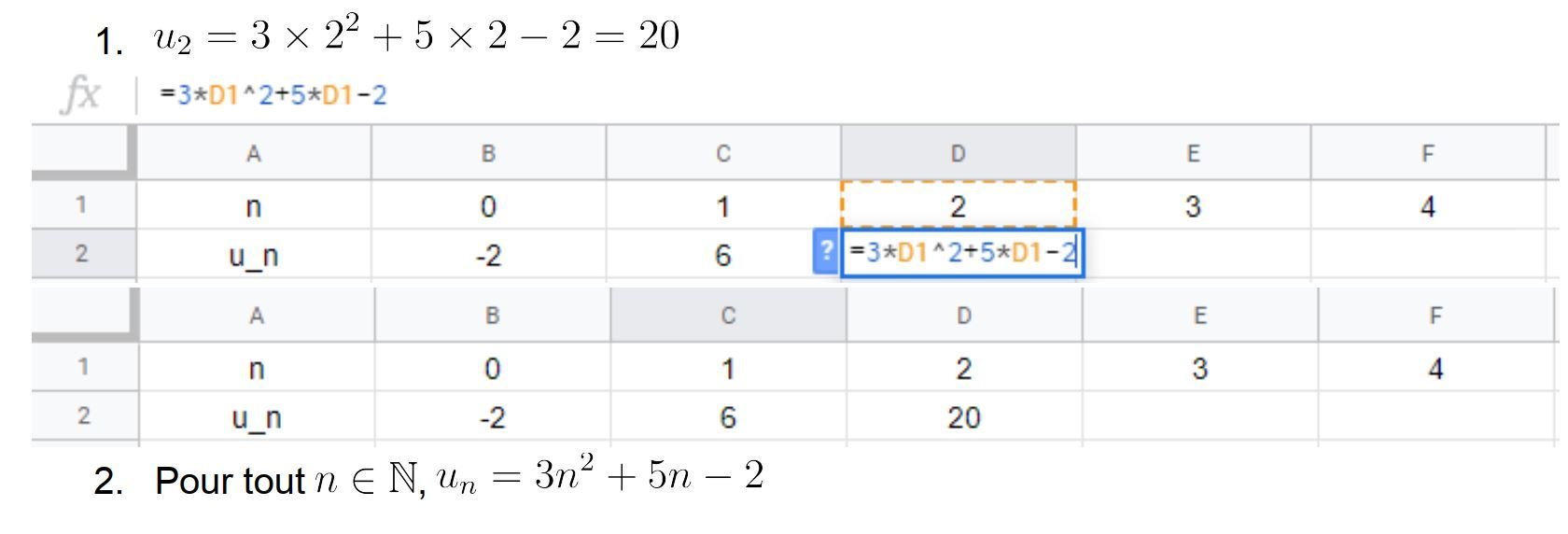 On souhaite introduire la notion de suite à l’aide d’un tableur afin de pouvoir trouver une expression du terme général en fonction de n. On considère la feuille de calcul suivante.