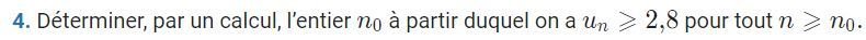 A partir de \(n_0=24\) on a \(u_n\geqslant 2,8\) pour tout \(n\geqslant n_0\).