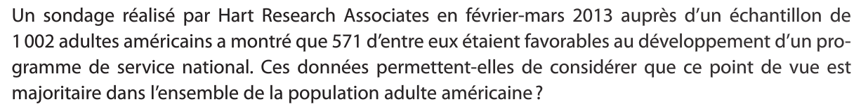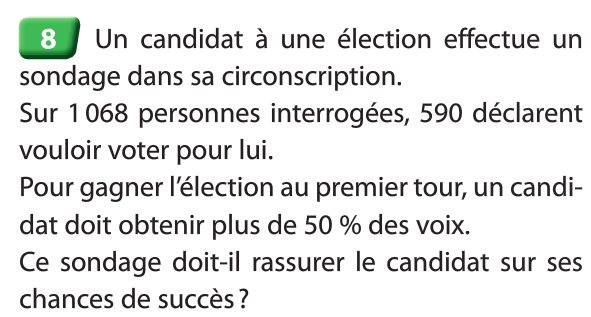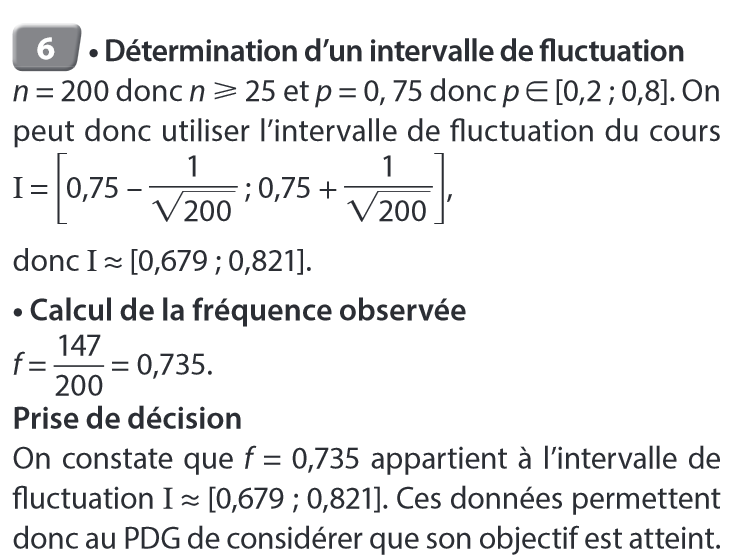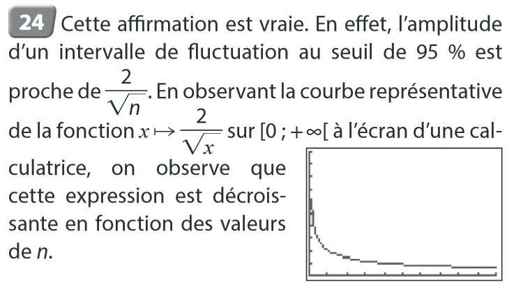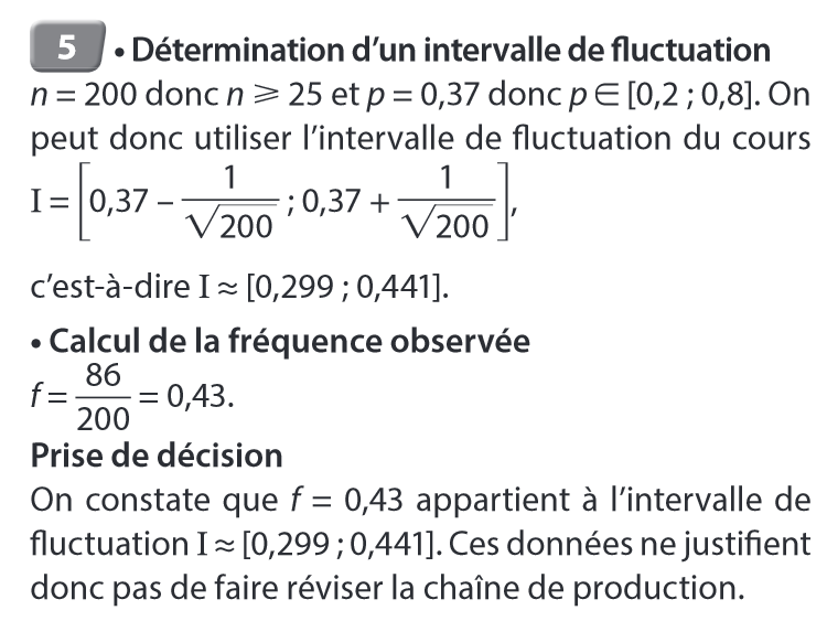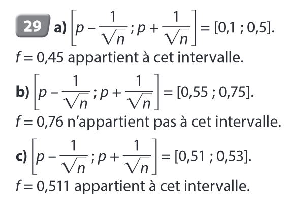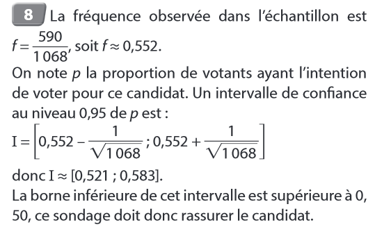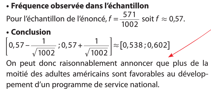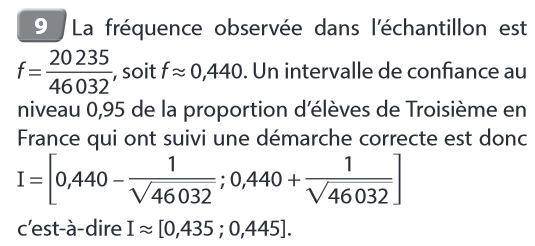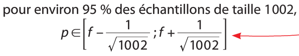 alors dans 95 % des échantillons de taille \(n\) la fréquence observée du caractère appartiendra à l’intervalle :