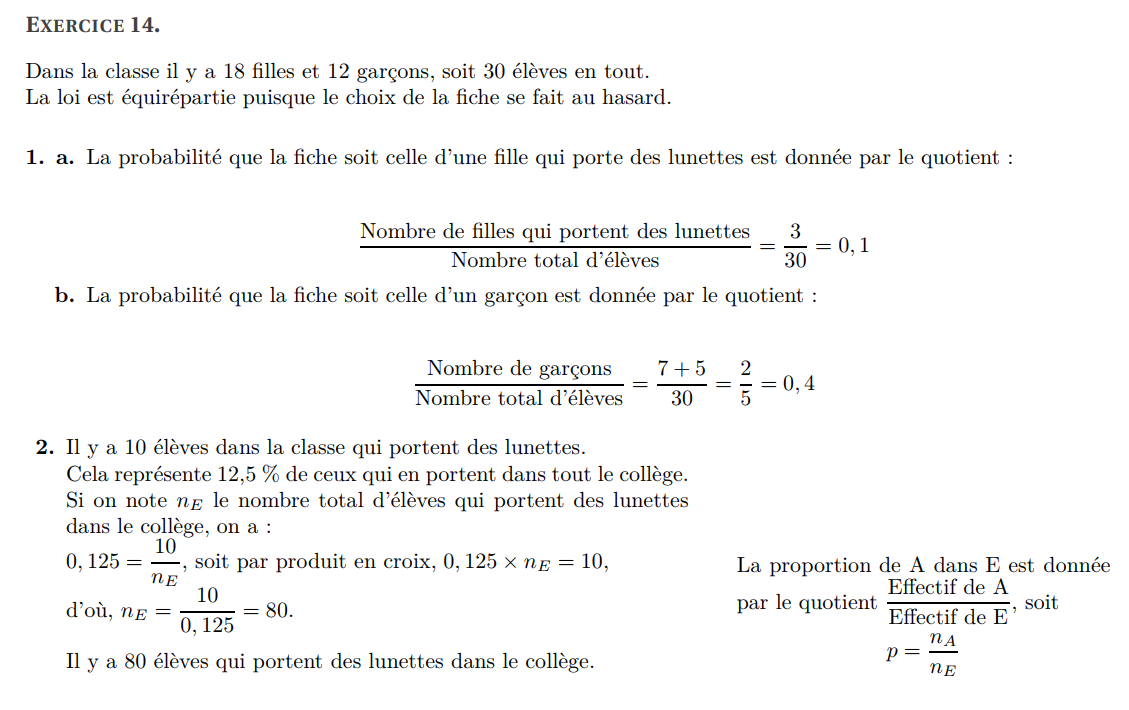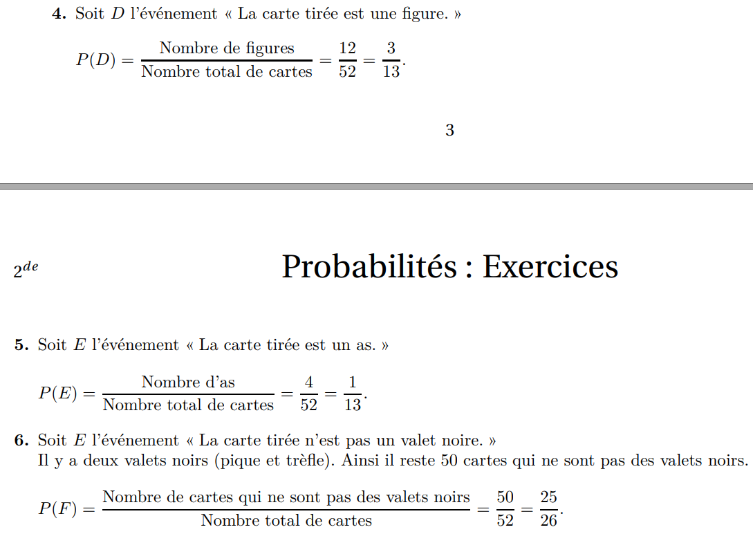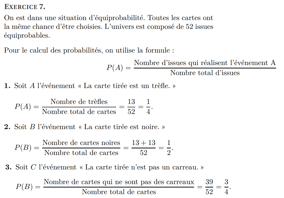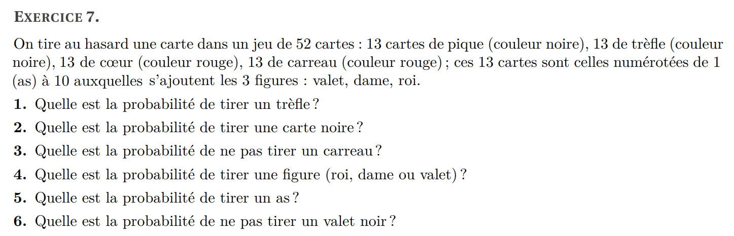 Exercice 2 : Un jeu de cartes est constitué de 52 cartes. On tire au hasard une carte de ce jeu.