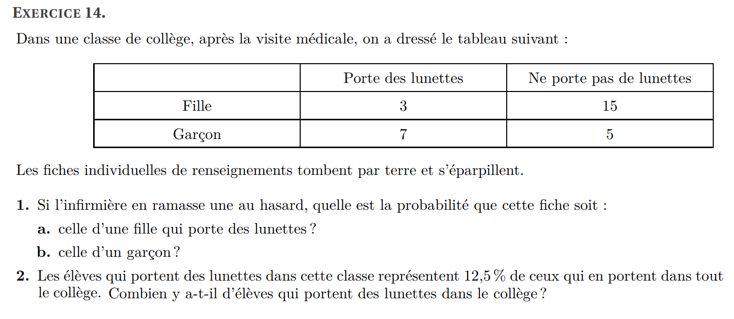 2 On choisit maintenant un garçon au hasard. Quelle est la probabilité pour qu’il vienne en voiture ?
