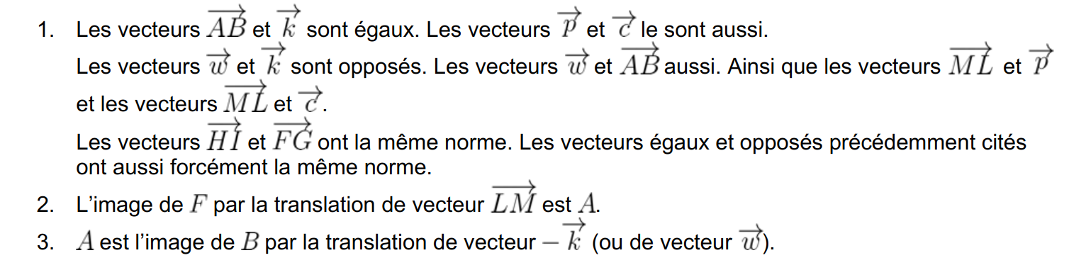 - Si \(EDAH\) est un parallélogramme alors les vecteurs \(\overrightarrow{ED}\) et \(\overrightarrow{HA}\) sont égaux.