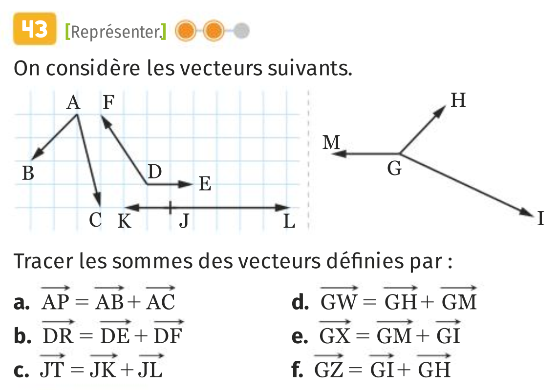 - Pour construire une somme de vecteurs, on représente le premier vecteur puis, à partir de l’extrémité de ce vecteur, on construit le deuxième. Le vecteur somme est défini par l’origine du premier vecteur et l’extrémité du second.