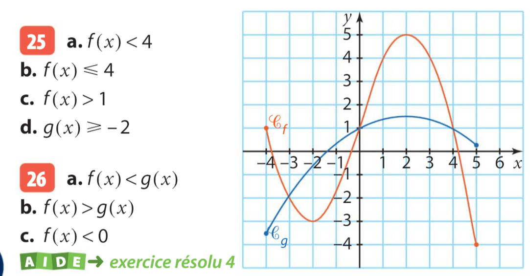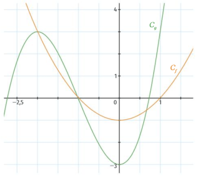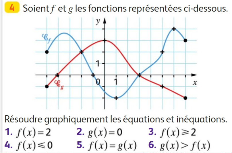 Question 6 : Résoudre graphiquement l'inéquation \(f(x)\leqslant g(x)\).