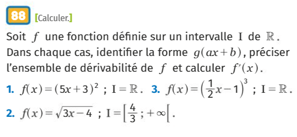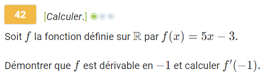 La limite de \(6a+3h-2\) quand \(h\) tend vers 0 est égale à \(6a-2\) donc pour tout réel \(a\), \(f\) est dérivable en \(a\) et \(f'(a)=6a-2\).